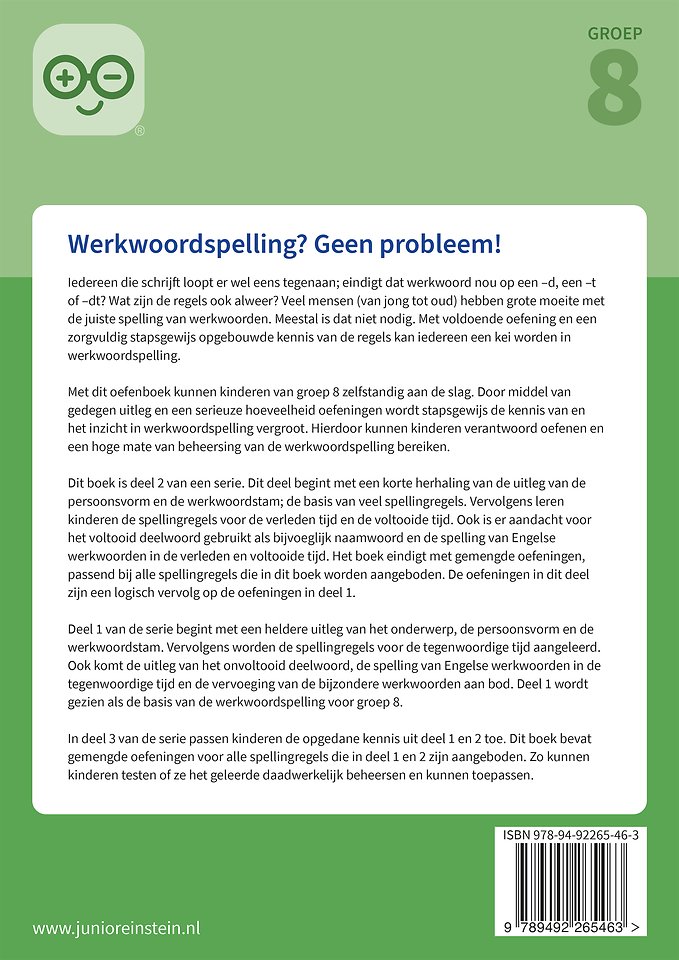 Met dit oefenboek kunnen kinderen van groep 8 zelfstandig aan de slag. Door middel van gedegen uitleg en een serieuze hoeveelheid oefeningen wordt stapsgewijs de kennis van en het inzicht in werkwoordspelling vergroot. Hierdoor kunnen kinderen verantwoord oefenen en een hoge mate van beheersing van de werkwoordspelling bereiken.