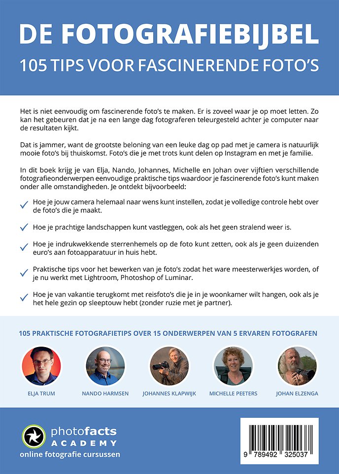 In dit boek krijg je van Elja, Nando, Johannes, Michelle en Johan over vijftien verschillende fotografieonderwerpen eenvoudige praktische tips waardoor je fascinerende foto’s kunt maken onder alle omstandigheden.