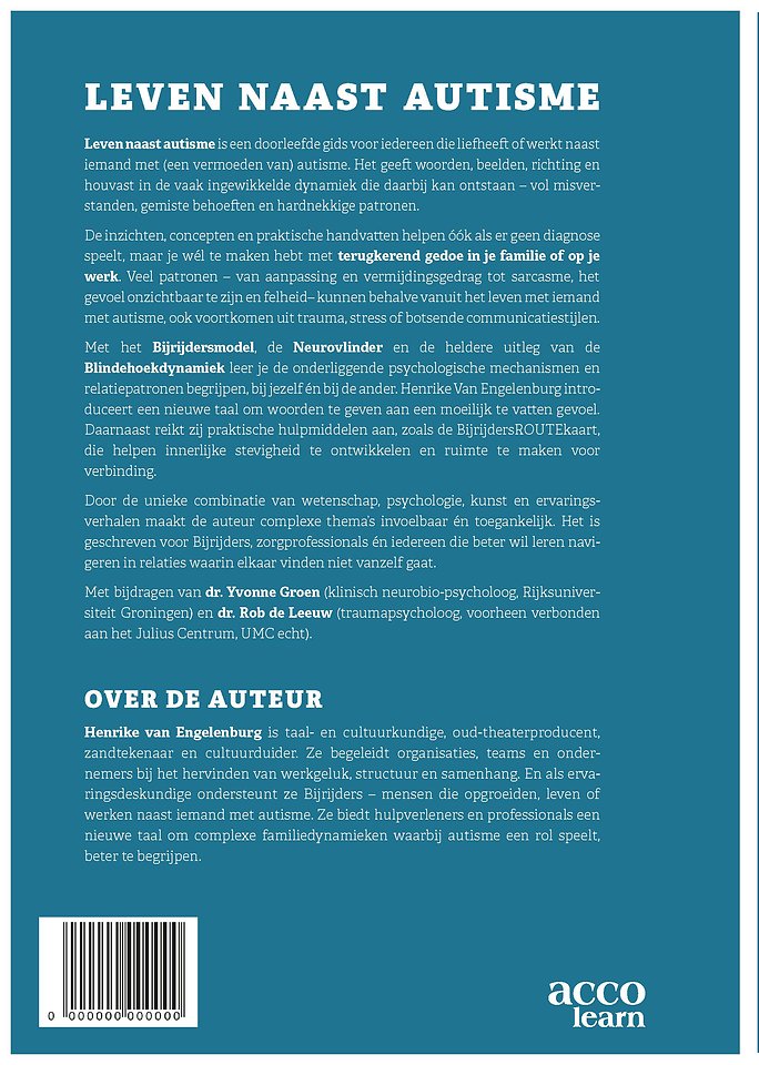 Leven naast autisme geeft houvast. Door de unieke combinatie van wetenschap, psychologie, kunst en ervaringsverhalen maakt Henrike van Engelenburg complexe thema’s invoelbaar én toegankelijk. Ze introduceert een nieuwe taal om moeilijk te vatten gevoelens en dynamieken te benoemen. Met het Bijrijdersmodel, de Neurovlinder en de Blindehoekdynamiek leer je de mechanismen achter herhalende vastlopende communicatie begrijpen. Praktische tools, zoals de BijrijdersROUTEkaart, helpen stevigheid te ontwikkelen en ruimte voor verbinding te creëren.