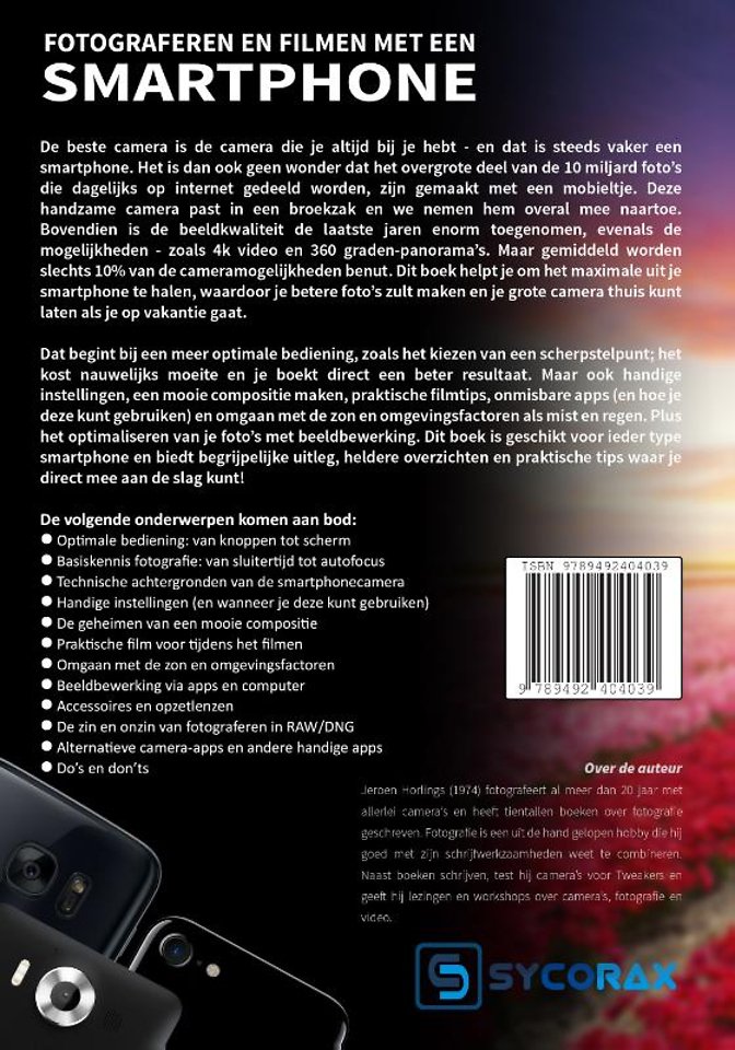 De beste camera is de camera die je altijd bij je hebt - en dat is steeds vaker een smartphone. Het is dan ook geen wonder dat het overgrote deel van de 10 miljard foto's die dagelijks op internet gedeeld worden, zijn gemaakt met een mobieltje. Deze handzame camera past in een broekzak en we nemen hem overal mee naartoe. Bovendien is de beeldkwaliteit de laatste jaren enorm toegenomen, evenals de mogelijkheden - zoals 4k video en 360 graden-panorama's. Maar gemiddeld worden slechts 10% van de cameramogelijkheden benut. Dit boek helpt je om het maximale uit je smartphone (en tablet) te halen, waardoor je betere foto's zult maken en je echte camera thuis kunt laten als je op vakantie gaat.