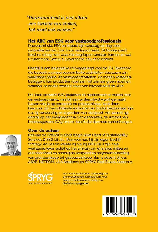 Dit boek probeert ESG praktisch en hanteerbaar te maken voor de vastgoedmarkt, waarbij een onderscheid wordt gemaakt tussen wat je op corporate en productniveau kunt doen. Daarvoor zijn verschillende instrumenten (tools) beschikbaar, o.a. bij verwerving en eigendom van vastgoed. Het accent ligt daarbij op het energiegebruik van gebouwen, de uitstoot van broeikasgassen (CO2) en de risico’s die daarmee samenhangen.
