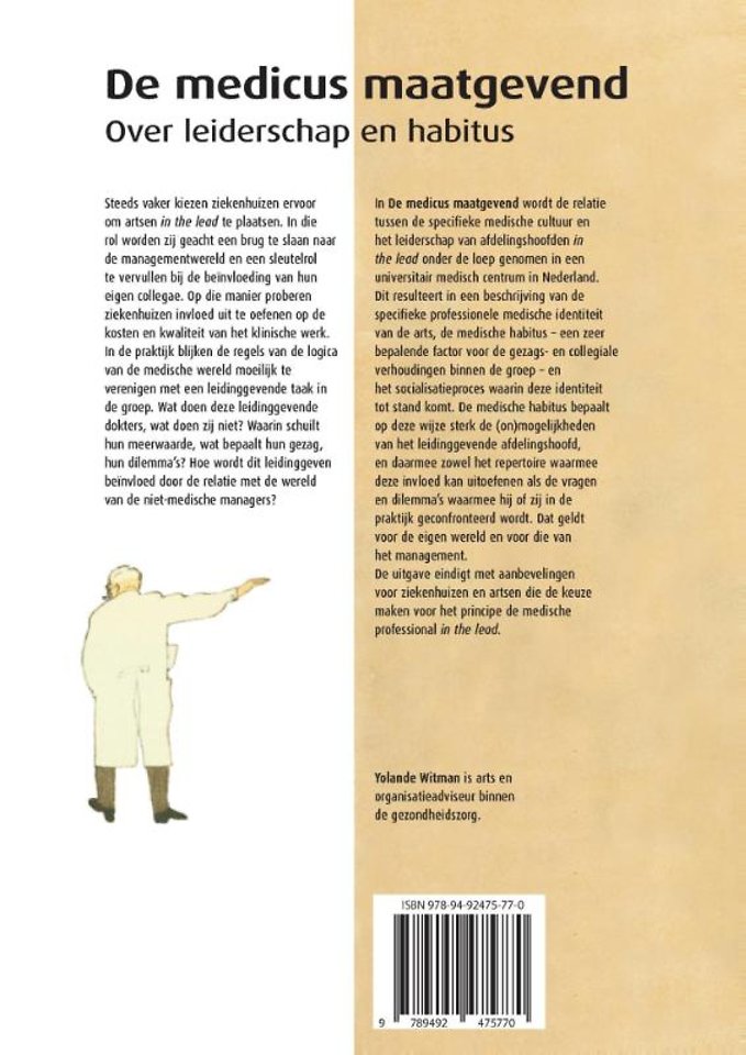 In De medicus maatgevend wordt de relatie tussen de specifieke medische cultuur en het leiderschap van afdelingshoofden in the lead onder de loep genomen in een universitair medisch centrum in Nederland. Dit resulteert in een beschrijving van de specifieke professionele medische identiteit van de arts, de medische habitus - een zeer bepalende factor voor de gezags- en collegiale verhoudingen binnen de groep - en het socialisatieproces waarin deze identiteit tot stand komt. De medische habitus bepaalt op deze wijze sterk de (on)mogelijkheden van het leidinggevende afdelingshoofd, en daarmee zowel het repertoire waarmee deze invloed kan uitoefenen als de vragen en dilemma's waarmee hij of zij in de praktijk geconfronteerd wordt. Dat geldt voor de eigen wereld en voor die van het management.