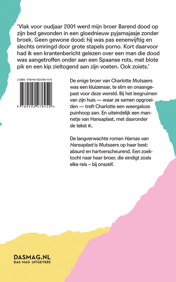 De langverwachte roman Harnas van Hansaplast is Mutsaers op haar best: absurd en hartverscheurend. Een zoektocht naar haar broer, die eindigt zoals elke reis uiteindelijk - bij onszelf.