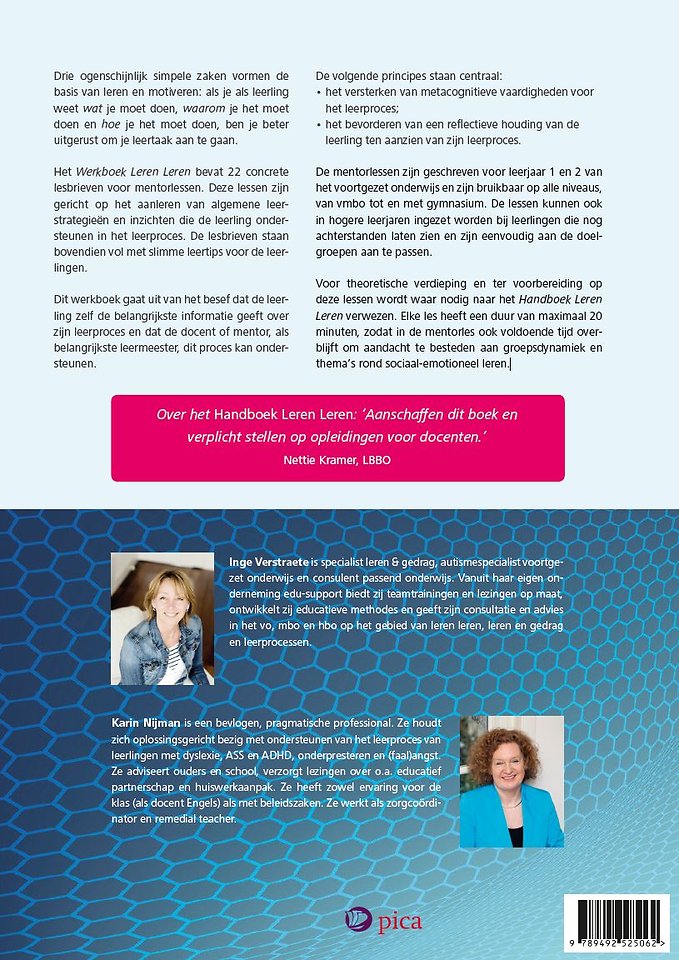 Het Werkboek Leren Leren bevat 22 concrete lesbrieven voor mentorlessen. Deze lessen zijn gericht op het aanleren van algemene leerstrategieën en inzichten die de leerling ondersteunen in het leerproces. De lesbrieven staan bovendien vol met slimme leertips voor de leerlingen.