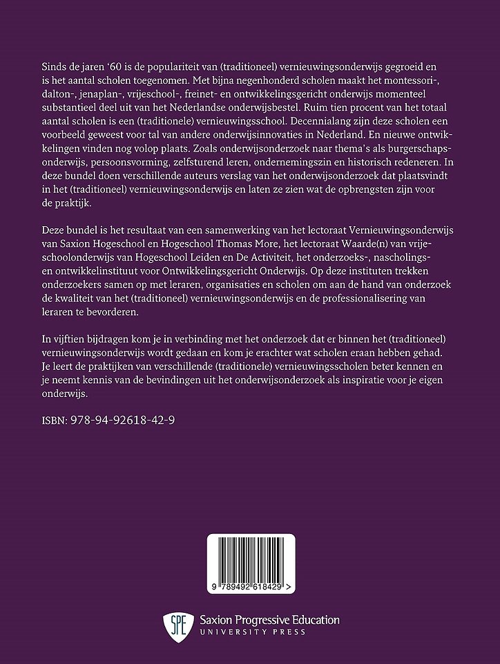 In vijftien bijdragen kom je in verbinding met het onderzoek dat er binnen het (traditioneel) vernieuwingsonderwijs wordt gedaan en kom je erachter wat scholen eraan hebben gehad. Je leert de praktijken van verschillende (traditionele) vernieuwingsscholen beter kennen en je neemt kennis van de bevindingen uit het onderwijsonderzoek als inspiratie voor je eigen onderwijs.