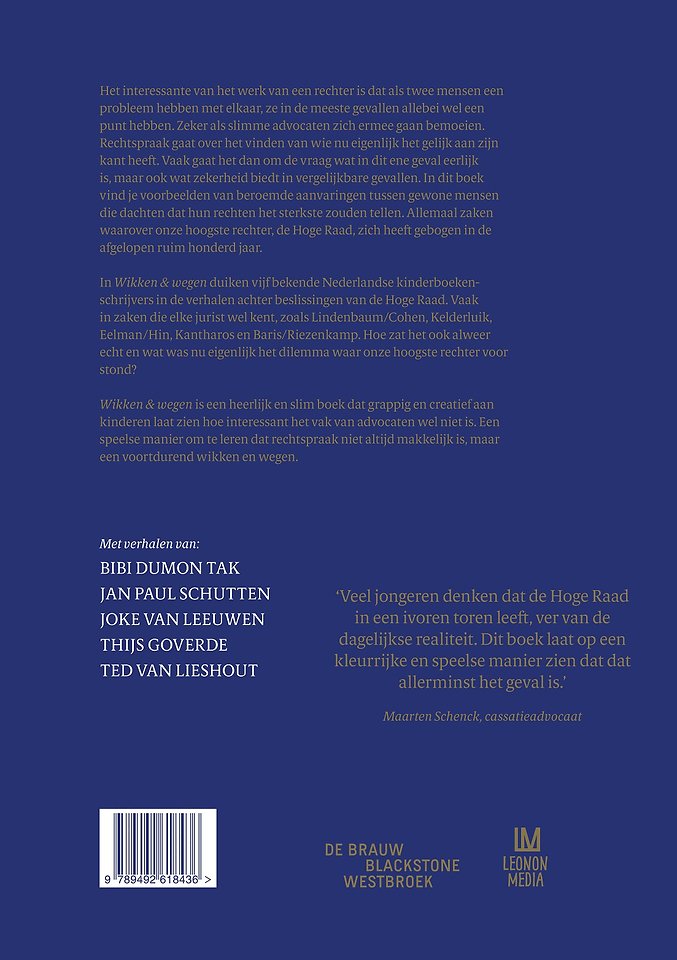 'Wikken & Wegen' is een heerlijk en slim boek dat grappig en creatief aan jongeren laat zien hoe interessant het vak van advocaten wel niet is. Een speelse manier om te leren dat rechtspraak niet altijd makkelijk is, maar een voortdurend wikken en wegen.