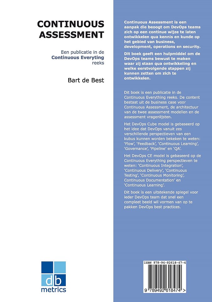 Dit boek is een publicatie in de Continuous Everything reeks. De content bestaat uit de business case voor Continuous Assessment, de architectuur van de twee assessment modellen en de assessment vragenlijsten.