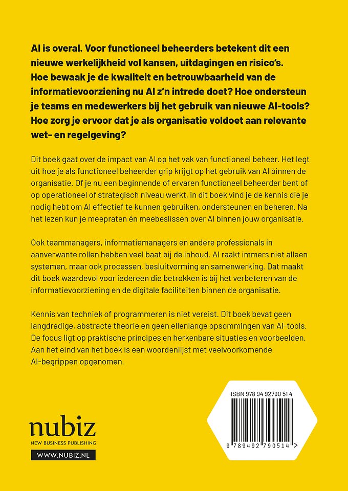 Dit boek gaat over de impact van AI op het vak van functioneel beheer – het legt uit hoe je als functioneel beheerder grip krijgt op AI binnen de organisatie. Of je nu een beginnende of ervaren functioneel beheerder bent of op operationeel of strategisch niveau werkt, in dit boek vind je de kennis die je nodig hebt om AI effectief te kunnen gebruiken, ondersteunen en beheren.