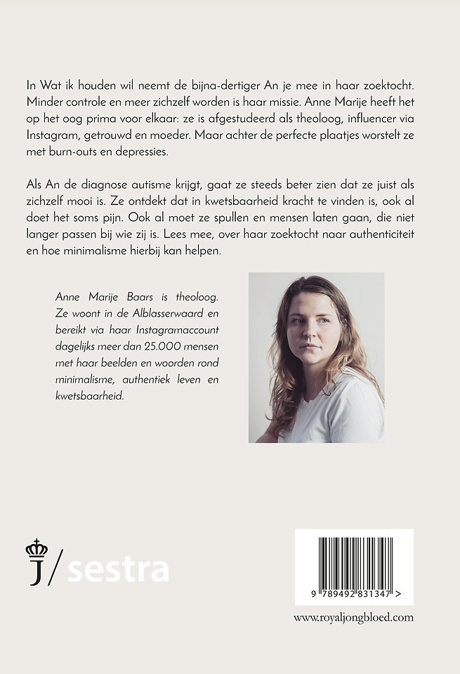 In Wat ik houden wil neemt de bijna dertiger Anne Marije je mee in haar zoektocht. Minder controle en meer zichzelf worden is haar missie. Ze heeft het voor het oog prima voor elkaar: afgestudeerd als theoloog, influencer via Instagram voor ruim 25000 volgers, getrouwd en mama van een lieve dochter. Maar achter de perfecte plaatjes worstelt ze met burn-outs en depressies. Totdat ze de diagnose autisme krijgt en steeds meer gaat ontdekken dat ze juist als zichzelf mooi is. Dat in kwetsbaarheid kracht te vinden is, ook al doet het soms pijn en moet je spullen en mensen laten gaan, die niet langer meer passen bij wie jij bent. Lees mee, over haar zoektocht naar authenticiteit en hoe minimalisme hierbij kan helpen.