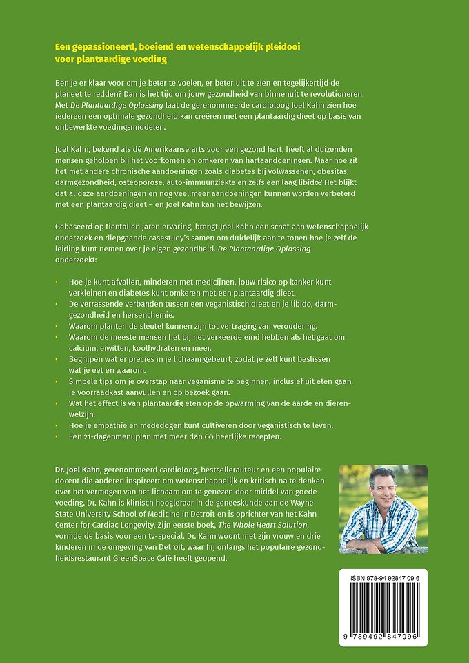 Dr. Joel Kahn, gerenommeerd cardioloog, bestsellerauteur en een populaire docent die anderen inspireert om wetenschappelijk en kritisch na te denken over het vermogen van het lichaam om te genezen door middel van goede voeding. Dr. Kahn is klinisch hoogleraar in de geneeskunde aan de Wayne State University School of Medicine in Detroit en is oprichter van het Kahn Center for Cardiac Longevity. Zijn eerste boek, The Whole Heart Solution, vormde de basis voor een tv-special. Dr. Kahn woont met zijn vrouw en drie kinderen in de omgeving van Detroit, waar hij onlangs het populaire gezondheidsrestaurant GreenSpace Café heeft geopend.