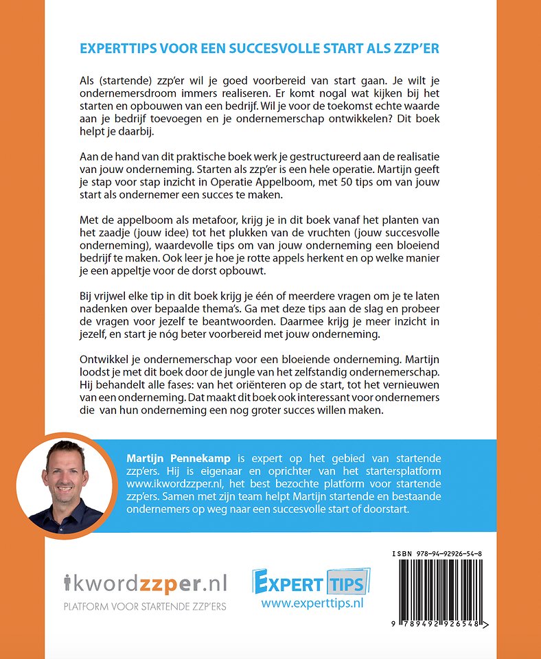Aan de hand van dit praktische boek werk je gestructureerd aan de realisatie van jouw onderneming. Starten als zzp’er is een hele operatie. Martijn geeft je stap voor stap inzicht in Operatie Appelboom, met 50 tips om van jouw start als ondernemer een succes te maken.