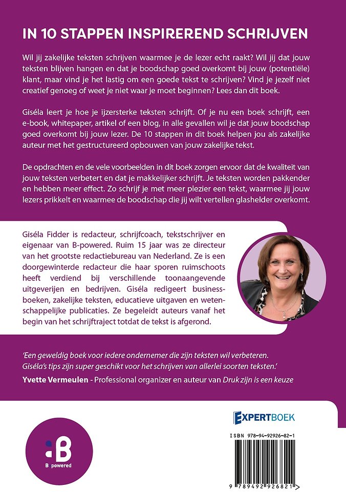 "Een geweldig boek voor iedere ondernemer die zijn teksten wil verbeteren. Giséla's tips zijn super geschikt voor het schrijven van allerlei soorten teksten." - Yvette Vermeulen, professional organizer en auteur van Drukzijn is een keuze