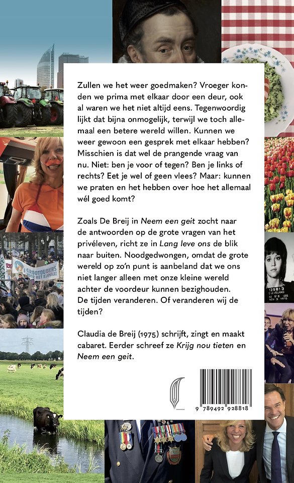 Zoals ze in Neem een geit zocht naar de antwoorden op de grote vragen van het privéleven, richt ze in Lang leve ons de blik naar buiten. Noodgedwongen, omdat de grote wereld op zo’n punt is aanbeland dat we ons niet langer alleen met onze kleine wereld achter de voordeur kunnen bezighouden. De tijden veranderen. Of veranderen wij de tijden?