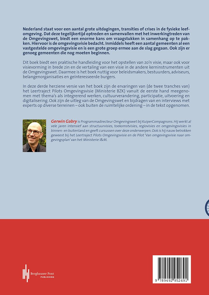 Dit boek biedt een praktische handleiding voor het opstellen van zo’n visie, maar ook voor visievorming in brede zin en de vertaling van een visie in de andere kerninstrumenten uit de Omgevingswet. Daarmee is het boek nuttig voor beleidsmakers, bestuurders, adviseurs, belangenorganisaties en geïnteresseerde burgers.