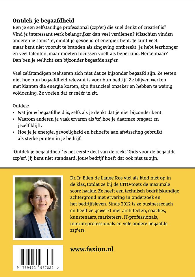 Meer over Ellen de Lange-RosBen je een zelfstandige professional (zzp’er) die snel denkt of creatief is? Vind je interessant werk belangrijker dan veel verdienen? Misschien vinden anderen je soms 'te', omdat je gevoelig of energiek bent. Je kunt veel, maar bent niet vooruit te branden als zingeving ontbreekt. Je hebt leerhonger en veel talenten, maar moeten focussen voelt als beperking. Herkenbaar? Dan ben je wellicht een bijzonder begaafde zzp’er.