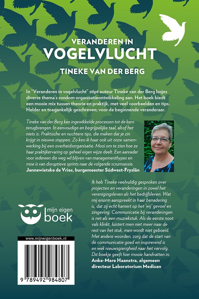 In “Veranderen in vogelvlucht” stipt auteur Tineke van der Berg losjes diverse thema’s rondom organisatieontwikkeling aan. Het boek biedt een mooie mix tussen theorie en praktijk, met veel voorbeelden en tips. Helder en toegankelijk geschreven; voor de beginnende veranderaar.
