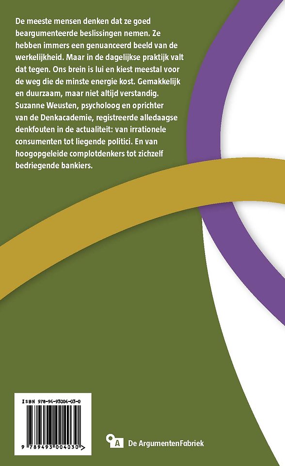 Suzanne Weusten, psycholoog en oprichter van de Denkacademie, registreerde alledaagse denkfouten in de actualiteit: van irrationele consumenten tot liegende politici. En van hoogopgeleide complotdenkers tot zichzelf bedriegende bankiers.