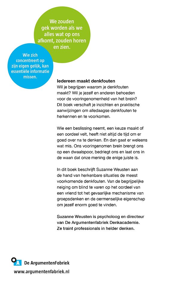 Suzanne Weusten (1953) is psycholoog en directeur van De Argumentenfabriek Denkacademie. Ze was 25 jaar werkzaam als journalist, onder andere als hoofdredacteur van Psychologie Magazine en lid van de hoofdredactie van de Volkskrant. In 2009 richtte ze samen met Kees Kraaijeveld de Denkacademie op, het opleidingsinstituut van De Argumentenfabriek. www.denkacademie.nl