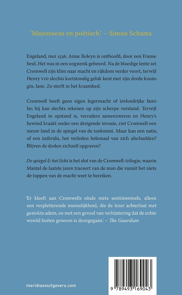 De spiegel & het licht is het daverende slotdeel van de trilogie, waarin Hilary Mantel de laatste jaren traceert in het leven van Thomas Cromwell, de jongeman die vanuit het niets de toppen van de macht weet te bereiken. Ze smeedt een allesomvattend portret van jager en prooi, van een woelige strijd tussen zowel het heden en het verleden als tussen de koninklijke wil en de visie van een common man: van een modern land dat zichzelf door conflict, gedrevenheid en moed vormgeeft.