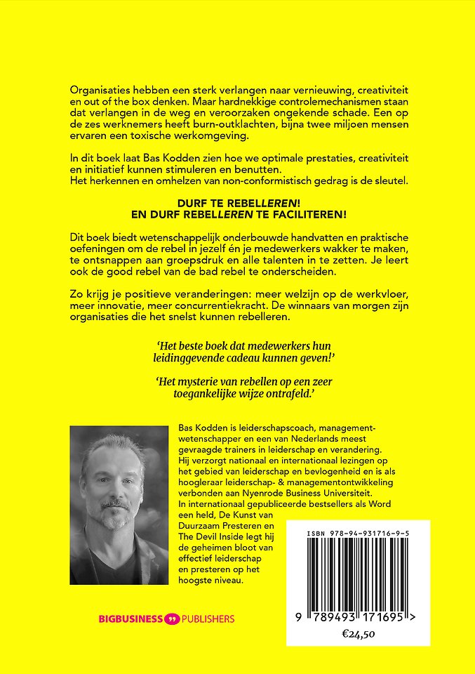 Meer over Bas KoddenOrganisaties hebben een sterk verlangen naar vernieuwing, creativiteit en out-of-the-box denken. Maar hardnekkige controlemechanismen staan dat verlangen in de weg en veroorzaken ongekende schade. Een op de zes werknemers heeft burn-outklachten, bijna twee miljoen mensen ervaren een toxische werkomgeving. In dit boek laat Bas Kodden zien hoe we optimale prestaties, creativiteit en initiatief kunnen stimuleren en benutten. Het herkennen en omhelzen van non-conformistisch gedrag is de sleutel. Durf te rebelleren! En durf rebelleren te faciliteren! Dit boek biedt wetenschappelijk onderbouwde handvatten en praktische oefeningen om de rebel in jezelf én je medewerkers wakker te maken, te ontsnappen aan groepsdruk en alle talenten in te zetten. Je leert ook de good rebel van de bad rebel te onderscheiden. Zo krijg je positieve veranderingen: meer welzijn op de werkvloer, meer innovatie, meer concurrentiekracht. De winnaars van morgen zijn organisaties die het snelst kunnen rebelleren. Het beste boek dat medewerkers hun leidinggevende cadeau kunnen geven! Het mysterie van rebellen op een zeer toegankelijke wijze ontrafeld.