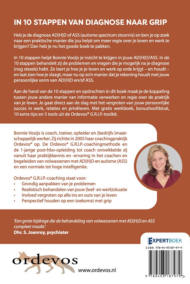 In 10 stappen helpt Bonnie Vooijs je inzicht te krijgen in jouw AD(H)D/ASS. In de 10 stappen behandelt zij de problemen en vragen die je mogelijk na je diagnose (nog steeds) hebt. Ze leert je hoe je je leven en werk op orde krijgt – en houdt – en laat zien hoe je slaagt, maar nu op zo’n manier dat je rekening houdt met jouw persoonlijke vorm van AD(H)D en/of ASS.