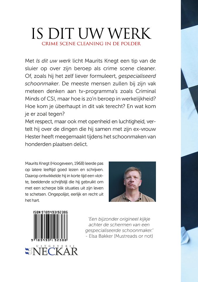 Met Is dit uw werk licht Maurits Knegt een tip van de sluier op over zijn beroep als crime scene cleaner. Of, zoals hij het zelf liever formuleert, gespecialiseerd schoonmaker. De meeste mensen zullen bij zijn vak meteen denken aan tv-programma’s zoals Criminal Minds of CSI, maar hoe is zo’n beroep in werkelijkheid? Hoe kom je überhaupt in dit vak terecht? En wat kom je er zoal tegen?