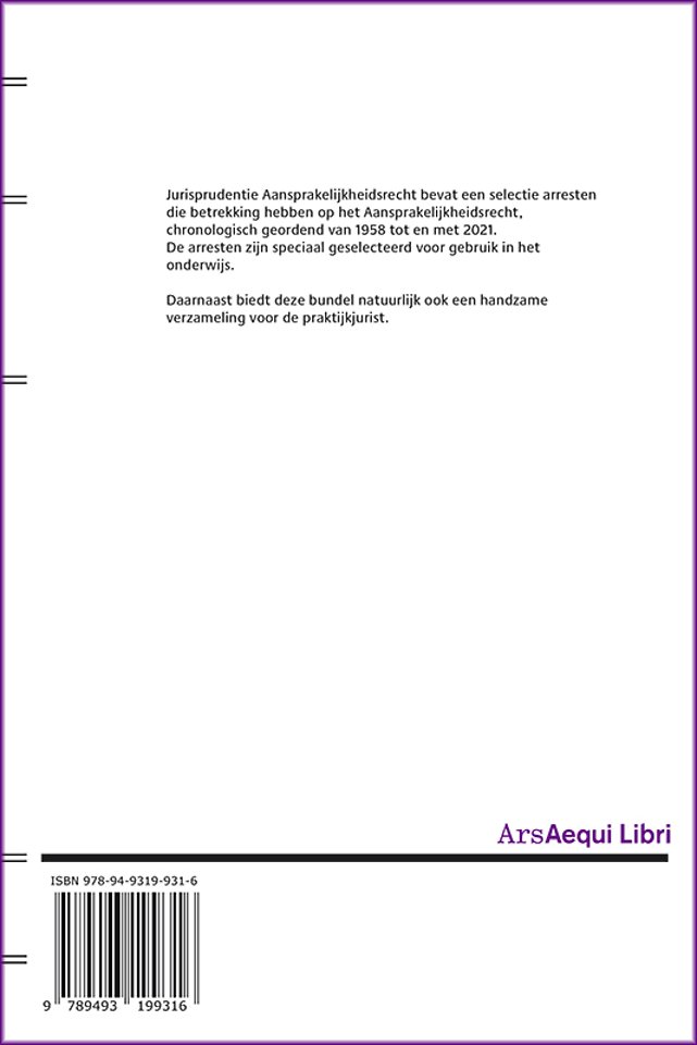 Jurisprudentie Aansprakelijkheidsrecht bevat een selectie arresten die betrekking hebben op het Aansprakelijkheidsrecht, chronologisch geordend van 1958 tot en met 2021. De arresten zijn speciaal geselecteerd voor gebruik in het onderwijs.