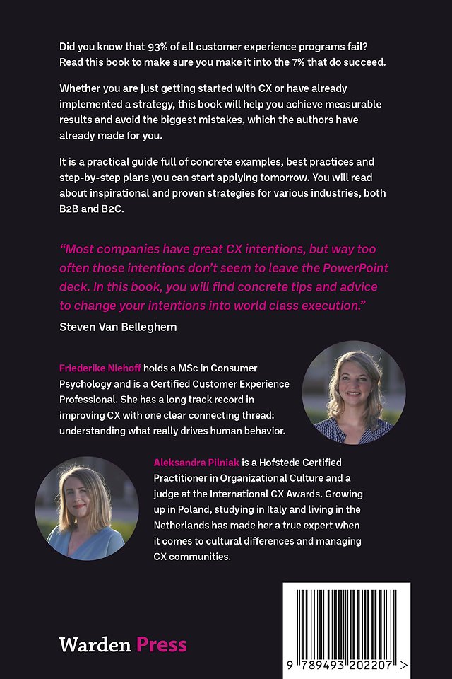 “This book is a must-read for all CX professionals out there. Learn from these two customer experience leaders, who have been there and done that in the world of CX and have the scars and stars to show for it. They honestly share the mistakes they made and how they relentlessly kept going.” - Nienke Bloem