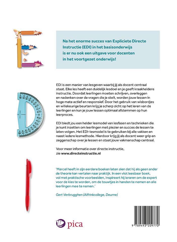 EDI is een manier van lesgeven waarbij jij als docent centraal staat. Elke les heeft een duidelijk lesdoel en je geeft kraakheldere instructie. Doordat leerlingen moeten schrijven, overleggen en nadenken over de vragen die je stelt, worden jouw lessen in hoge mate actief en responsief. Door het gebruik van wisbordjes en willekeurige beurten krijg je scherp zicht op het leren van de leerlingen en kun je jouw lessen optimaal afstemmen op hun leerproces.