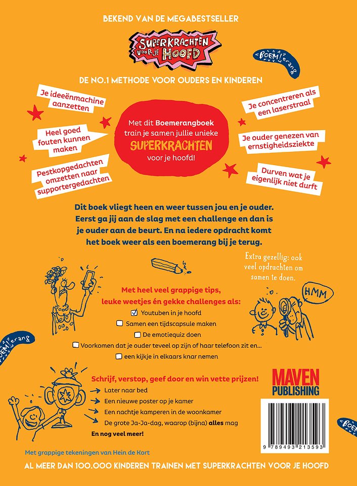 Met 'Het Boemerangboek' is De Jong terug met een spiksplinternieuw omstebeurtboek om samen de skills te ontdekken waar je gelukkig van wordt. Om en om doen ouder en kind een challenge, meestal alleen en af en toe samen. Daarna verstop je het boek op een vaste verstopplek en laat je de ander met een codewoord weten dat hij of zij aan de beurt is. Het boek vliegt dus als een boemerang heen en weer. Met de 39 challenges train ondertussen de superkrachten in je hoofd, terwijl je spaart voor vette prijzen. En natuurlijk staat het boek ook bomvol grappige tips en weetjes voor kind én ouder.