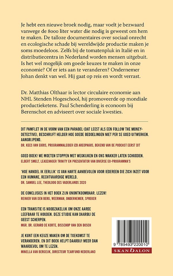 € 19,95. Je hebt een nieuwe broek nodig, maar voelt je bezwaard vanwege de 8000 liter water die nodig is geweest om hem te maken. De talloze documentaires over sociaal onrecht en ecologische schade bij wereldwijde productie maken je soms moedeloos. Zelfs bij de tomatenpluk in Italië en in distributiecentra in Nederland worden mensen uitgebuit. Is het wel mogelijk om goede keuzes te maken in onze economie? Of er iets aan te veranderen? Ondernemer Johan denkt van wel. Hij gaat op reis en wordt verrast.