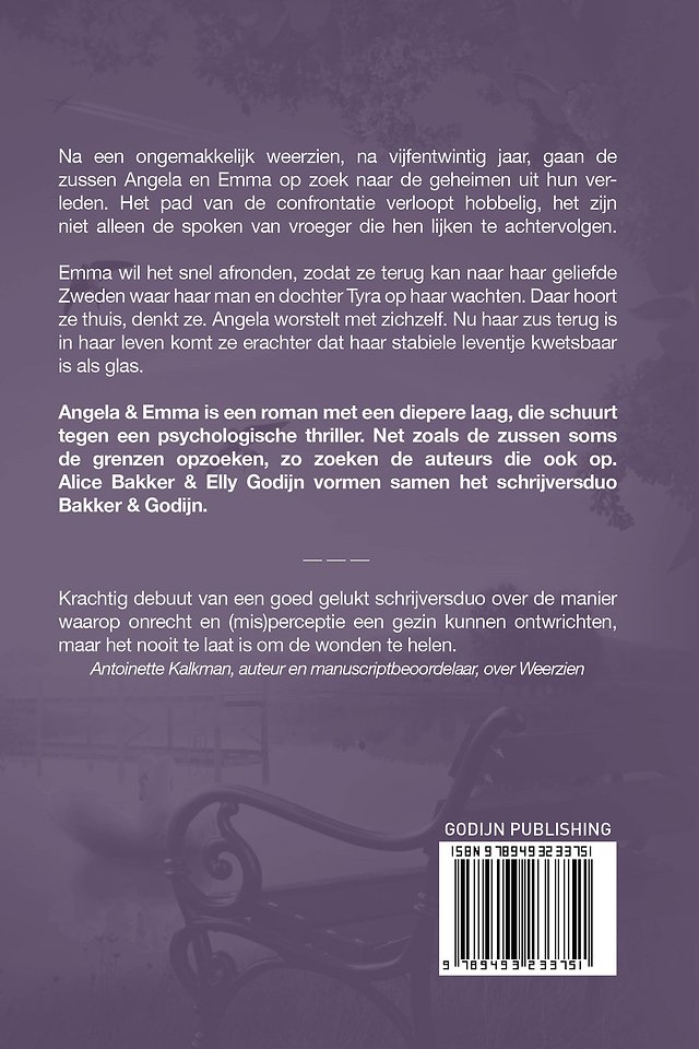 Angela & Emma is een roman met een diepere laag, die schuurt tegen een psychologische thriller. Net zoals de zussen soms de grenzen opzoeken, zo zoeken de auteurs die ook op. Alice Bakker & Elly Godijn vormen samen het schrijversduo Bakker & Godijn.
