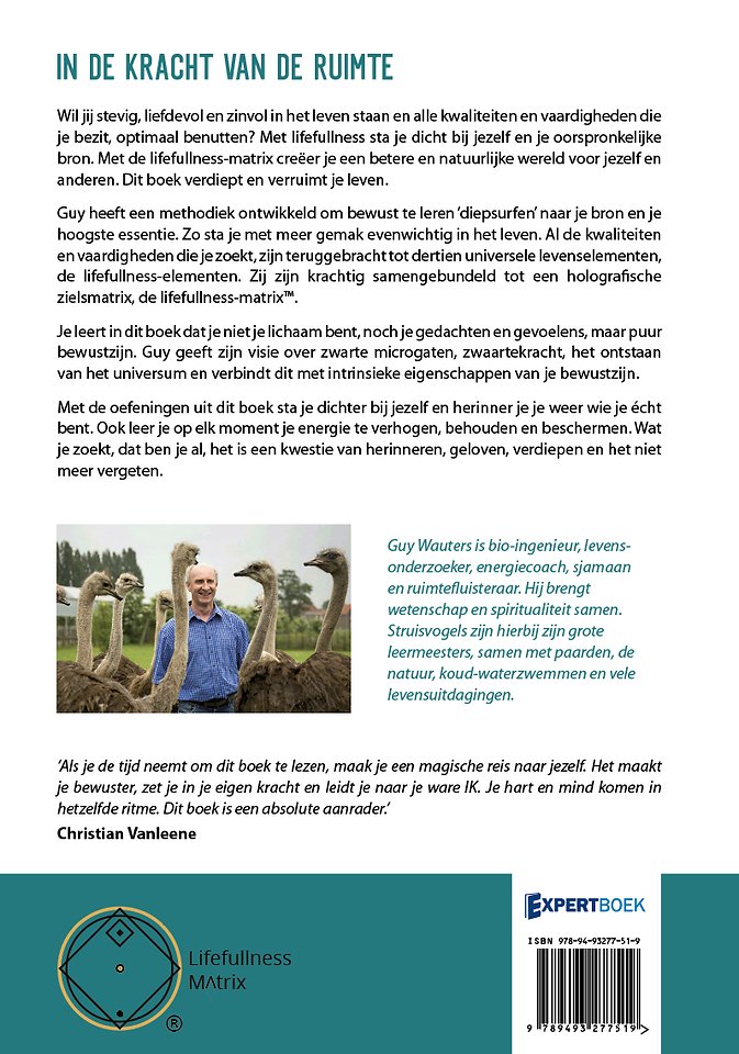 Guy heeft een methodiek ontwikkeld om bewust te leren ‘diepsurfen’ naar je bron en je hoogste essentie. Al de kwaliteiten en vaardigheden die je zoekt, zijn vereenvoudigd tot dertien universele levenselementen, de lifefullness-elementen. Zij zijn krachtig samengebundeld tot een holografische zielsmatrix, de lifefullness-matrix™.