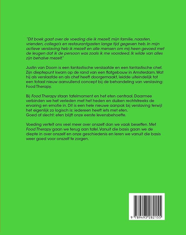 Justin van Doorn is een fantastische verslaafde en een fantastische chef. Zijn dieptepunt kwam op de rand van een flatgebouw in Amsterdam. Wat hij als verslaafde en als chef heeft doorgemaakt leidde uiteindelijk tot een totaal nieuw aanvullend concept bij de behandeling van verslaving: Food Therapy.