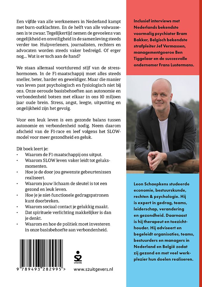 In de F1-maatschappij moet alles steeds sneller, beter, harder en geweldiger. Maar die manier van leven past psychologisch en fysiologisch niet bij ons. Onze oeroude basisbehoeften aan autonomie en verbondenheid botsen met elkaar in ons 10 miljoen jaar oude brein. Stress, angst, leegte, uitputting en ongelijkheid zijn het gevolg. Voor een leuk leven is een gezonde balans tussen autonomie en verbondenheid nodig. Neem daarom afscheid van de F1-race en leef volgens het SLOW-model voor meer gezondheid en geluk.