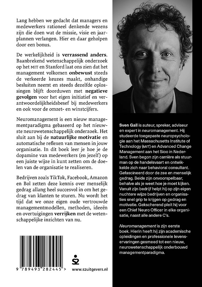 Sven Gall is auteur, spreker, adviseur en expert in neuromanagement. Hij studeerde toegepaste neuropsychologie aan het Massachusetts Institute of Technology (MIT) en Advanced Change Management aan het Sioo in Nederland.