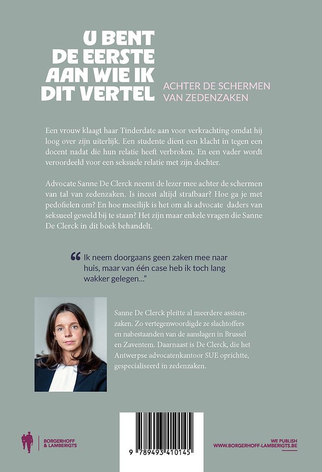 Advocate Sanne De Clerck neemt de lezer mee achter de schermen van tal van zedenzaken. Is incest altijd strafbaar? Hoe ga je met pedofielen om? En hoe moeilijk is het om als advocate daders van seksueel geweld bij te staan? Het zijn maar enkele vragen die Sanne De Clerck in dit boek behandelt.