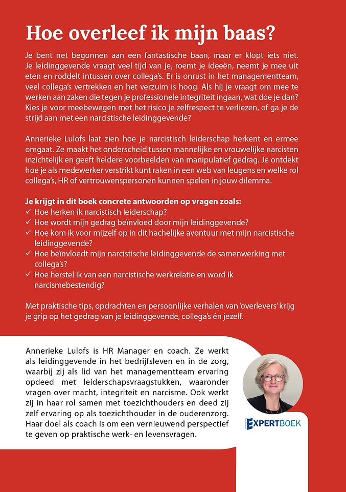 Annerieke Lulofs laat zien hoe je narcistisch leiderschap herkent en ermee omgaat. Ze maakt het onderscheid tussen mannelijke en vrouwelijke narcisten inzichtelijk en geeft heldere voorbeelden van manipulatief gedrag. Je ontdekt hoe je als medewerker verstrikt kunt raken in een web van leugens en welke rol collega’s, HR of vertrouwenspersonen kunnen spelen in jouw dilemma.