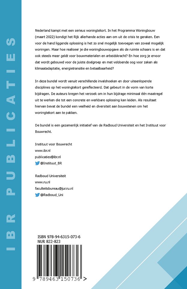 In deze bundel wordt vanuit verschillende invalshoeken en door uiteenlopende disciplines op het woningtekort gereflecteerd. Dat gebeurt in de vorm van korte bijdragen. De auteurs kregen het verzoek om in hun bijdrage minimaal één maatregel uit te werken die tot een concrete en werkbare oplossing kan leiden. Als resultaat hiervan bevat de bundel een veelheid en diversiteit aan bouwstenen om het woningtekort aan te pakken.