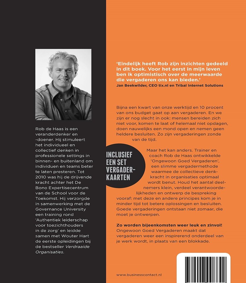 Trainer en coach Rob de Haas ontwikkelde 'Ongewoon Goed Vergaderen', een slimme vergadermethode waarmee de collectieve denkkracht in organisaties optimaal wordt benut. Houd het aantal deelnemers klein, verdeel verantwoordelijkheden en ontwerp de bespreking vooraf: met deze en andere principes kom je in minder tijd tot betere oplossingen en besluiten. Goede vergaderingen ontstaan niet zomaar, die moet je ontwerpen.