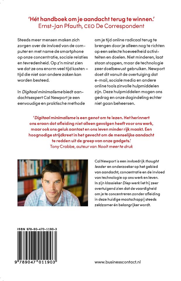 'Digitaal minimalisme is een genot om te lezen. Het herinnert ons eraan dat afleiding niet alleen gevolgen heeft voor ons werk, maar ook ons geluk aantast en ons leven minder rijk maakt. Een hoognodige strijdkreet in het gevecht om de menselijke aandacht te redden uit de greep van onze gadgets.' – Tony Crabbe, auteur van ‘Nooit meer te druk’