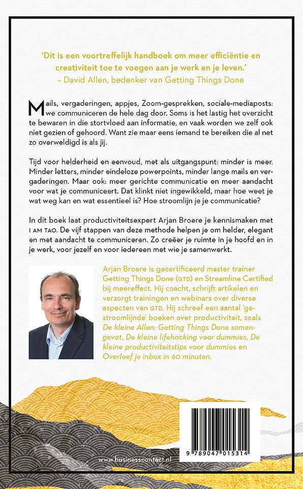 In dit boek laat productiviteitsexpert Arjan Broere je kennismaken met I AM TAO, de methode om helder, elegant en met aandacht te communiceren. En dat is hard nodig, want met de stortvloed aan mails, vergaderingen, appjes, sociale-mediaposts en andere informatie die we op ons af krijgen is het soms lastig het overzicht te bewaren. Vaak worden we zelf ook niet gezien of gehoord, want zie maar eens iemand te bereiken die al net zo overweldigd is als jij.