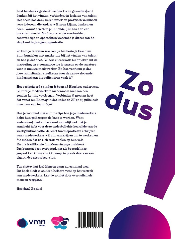 Laat hardnekkige denkbeelden los en ga anders(om) denken bij het vinden, verbinden én loslaten van talent. Het boek Hoe dan? is een uniek en praktisch werkboek voor iedereen die anders wil leren kijken, denken en doen. Vanuit een stevige inhoudelijke basis en een praktisch model. Vol inspirerende voorbeelden, concrete tips en opdrachten waarmee je direct aan de slag kunt in je eigen organisatie.
