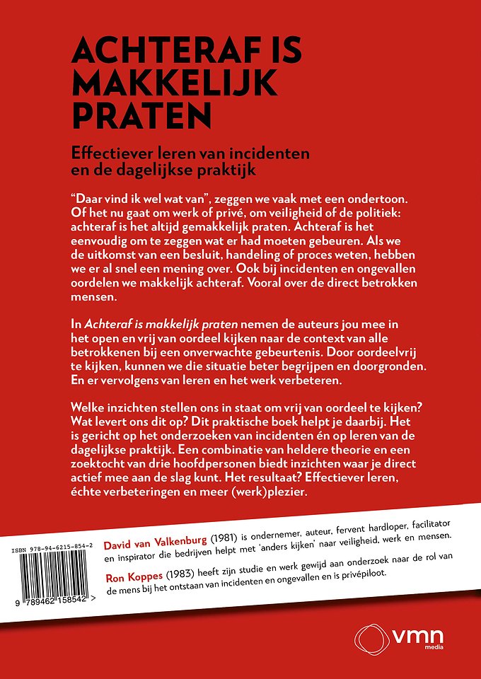 “Daar vind ik wel wat van”, zeggen we vaak met een ondertoon. Of het nu gaat om werk of privé, om veiligheid of de politiek: achteraf is het altijd gemakkelijk praten. Achteraf is het eenvoudig om te zeggen wat er had moeten gebeuren. Als we de uitkomst van een besluit, handeling of proces weten, vinden we er al snel iets van. Ook bij incidenten en ongevallen oordelen we makkelijk achteraf. Vooral over de direct betrokken mensen.