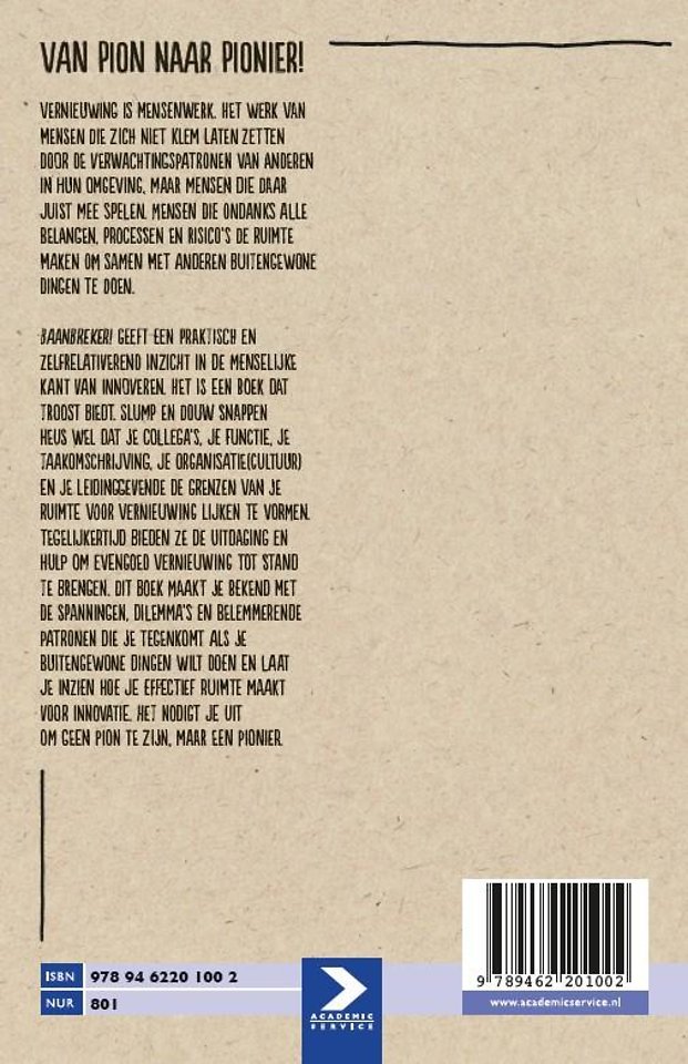 Dit boek maakt u bekend met de spanningen, dilemma’s en belemmerende patronen die u tegenkomt als u buitengewone dingen wilt doen en laat u inzien hoe u effectief ruimte maakt voor innovatie. Het nodigt u uit om geen pion te zijn, maar een pionier.