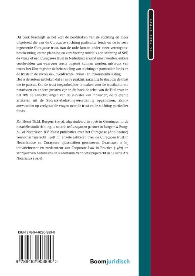 Dit boek beschrijft in het kort de hoofdzaken van de stichting en meer uitgebreid die van de Curaçaose stichting particulier fonds en de in 2012 ingevoerde Curaçaose trust. Aan de orde komen onder meer vermogensbescherming, estate planning en certificering middels een stichting of SPF, de vraag of een Curaçaose trust in Nederland erkend moet worden, enkele voorbeelden van waarvoor trusts opgezet kunnen worden, misbruik van trusts, het Ubo-register, de behandeling van stichtingen particulier fonds en de trusts in de successie-, overdrachts-, winst- en inkomstenbelasting.