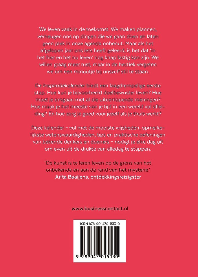 Meer over Redactie Business ContactIn de 'Inspiratiekalender 2022' vind je de beste inzichten, mooiste wijsheden, opmerkelijkste wetenswaardigheden, tips en praktische oefeningen van wetenschappers, psychologen en andere bekende denkers en doeners.