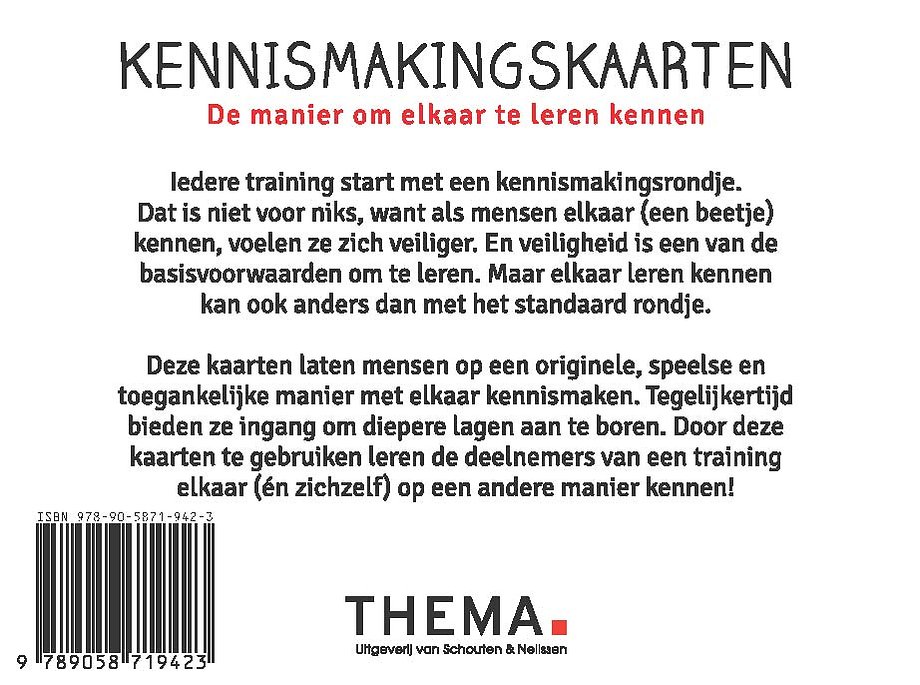 De 'Kennismakingskaarten' laten mensen op een originele, speelse en toegankelijke manier met elkaar kennismaken. Tegelijkertijd bieden ze ingang om diepere lagen aan te boren. Door deze kaarten te gebruiken leren de deelnemers van een training elkaar (én zichzelf) op een andere manier kennen!